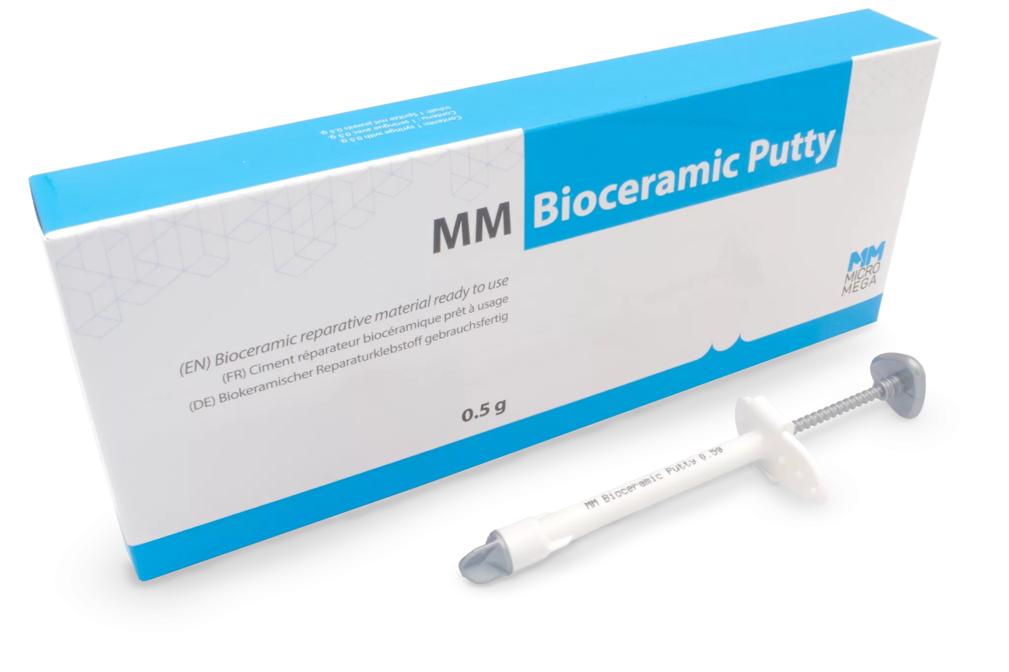 Bioceramic Putty is a denser material indicated for root repairs (perforations, resorptions, pulp capping) or retrograde fillings in endodontic surgery.