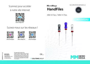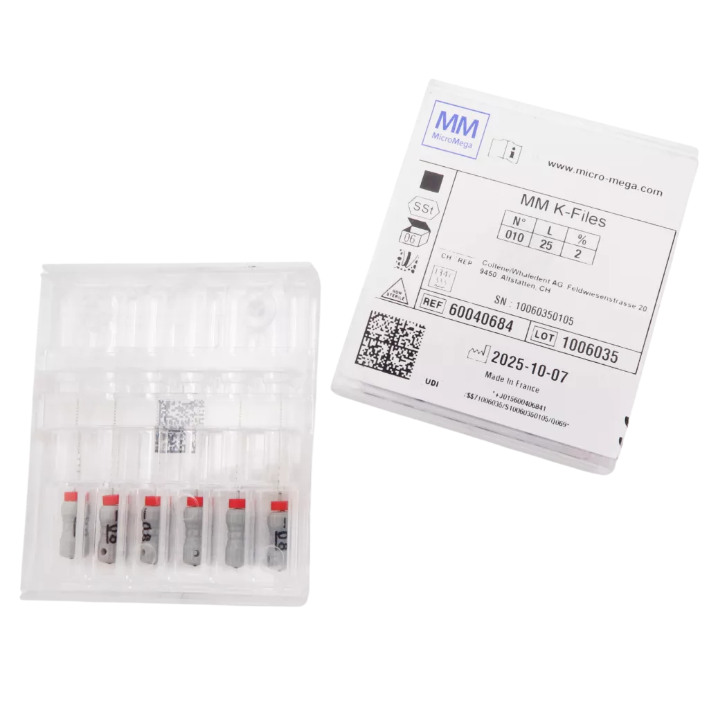 MicroMega MM K-Files sont des limes manuelles endodontiques conçues pour le cathétérisme et la mise en forme initiale des canaux radiculaires. Elles constituent un complément essentiel aux instruments en Nickel-Titane, assurant le repérage du canal avant l’étape de mise en forme mécanisée.